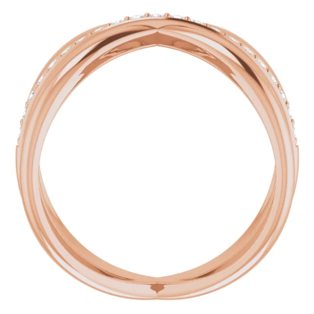 Crafted in your choice of 14KT white, rose, or yellow gold, the Ivy Ring offers versatility to complement any personal aesthetic or existing jewelry collection. The distinctive criss-cross setting creates dimensional depth while allowing maximum light reflection through the diamonds.