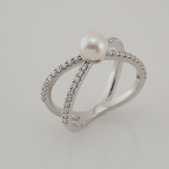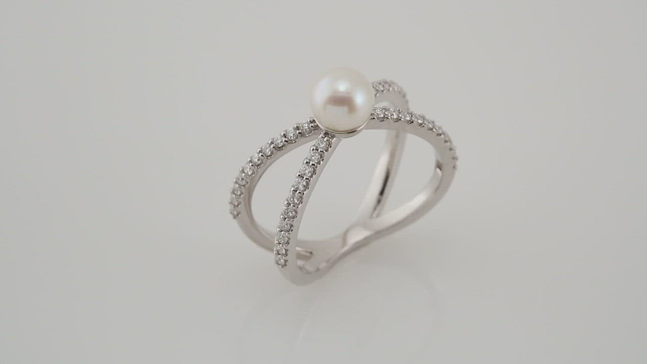 Introducing the Ivy Pearl and Diamond Ring, a sophisticated piece that seamlessly blends timeless elegance with contemporary design. This exquisite ring features a lustrous 6.0-6.5 mm cultured freshwater pearl of AA quality, complemented by 0.33 ctw of sparkling round brilliant cut diamonds in G-H color with I1 clarity. The pearl's luminous white tone creates a striking contrast against the diamond accents, while the distinctive X-band design adds modern flair to this classic combination.